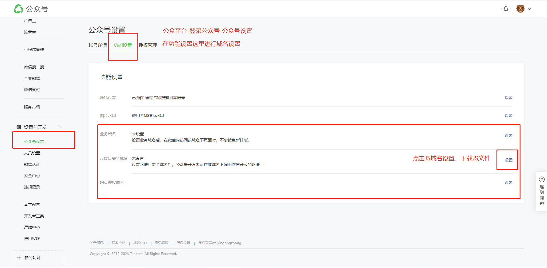 3:点击公众号设置-功能设置-下载JS文件。